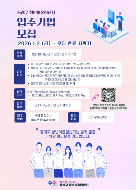동래구 청년어울림센터에서는 청년 (예비)창업가를 대상으로 힘찬 창업의 꿈을 펼쳐나갈 수 있는 창업공간 입주자를 모집합니다.