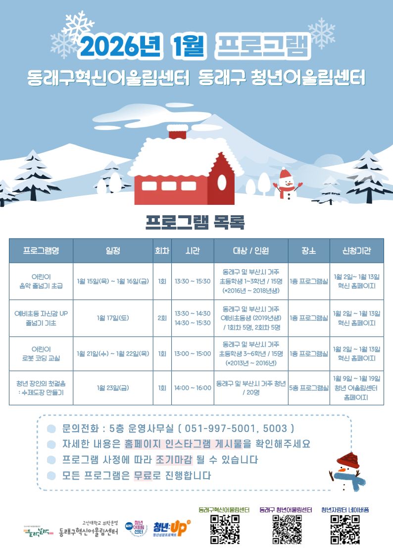 안녕하세요. 동래구 혁신어울림센터, 동래구청년어울림센터입니다. ^^1월 프로그램을 알려드립니다여러분들의 많은 관심과 참여 부탁드립니다.각 프로그램 접수는 동래구혁신 및 동래구 청년홈페이지에서 신청 가능합니다.